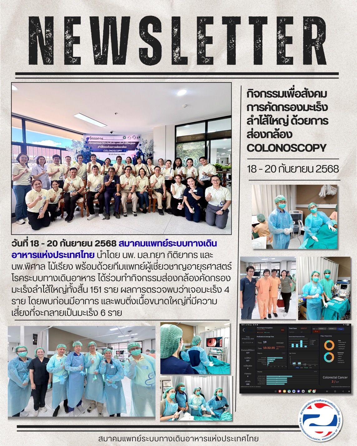 สมาคมแพทย์ระบบทางเดินอาหารแห่งประเทศไทย นำโดย นพ. มล.ทยา กิติยากร และ นพ.พิศาล ไม้เรียง พร้อมด้วยทีมแพทย์ผู้เชี่ยวชาญอายุรศาสตร์โรคระบบทางเดินอาหาร ได้ร่วมทำกิจกรรมส่องกล้องคัดกรองมะเร็งลำไส้ใหญ่ทั้งสั้น 151 ราย ผลการตรวจพบว่าเจอมะเร็ง 4ราย โดยพบก่อนมีอาการ และพบติ่งเนื้อขนาดใหญ่ที่มีความเสี่ยงที่จะกลายเป็นมะเร็ง 6 ราย