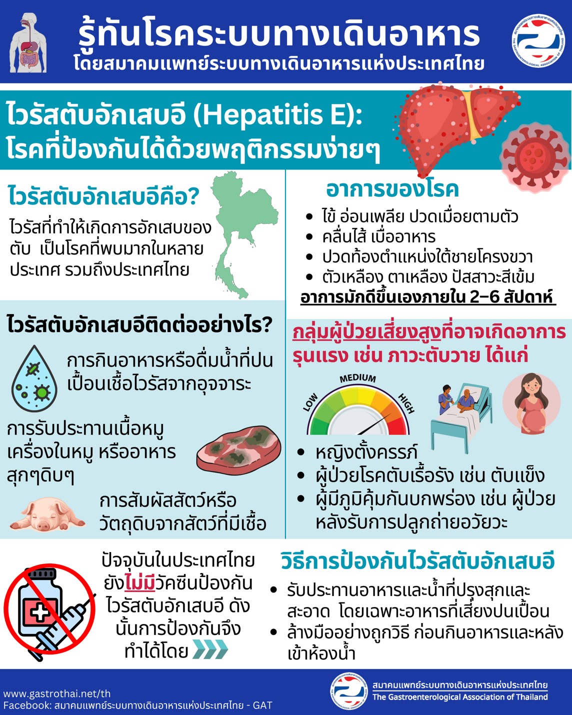 ไวรัสตับอักเสบอีเป็นโรคที่พบได้ในประเทศไทย โดยเฉพาะจากการรับประทานอาหารที่ไม่สุกหรือปนเปื้อนเชื้อ แม้ผู้ป่วยส่วนใหญ่จะหายได้เอง แต่โรคอาจรุนแรงถึงขั้นตับวายได้ในกลุ่มเสี่ยง เช่น หญิงตั้งครรภ์และผู้ป่วยตับเรื้อรัง ปัจจุบันยังไม่มีวัคซีนที่ใช้ในไทย การป้องกันจึงต้องอาศัยสุขอนามัยพื้นฐานและการเลือกรับประทานอาหารปรุงสุกเป็นหลัก หากมีอาการผิดปกติควรรีบพบแพทย์เพื่อรับการดูแลที่เหมาะสม